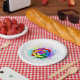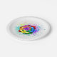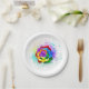 Large, blooming rose with rainbow petals on white background, painted over with splashes of colorful, bright paint. 3d