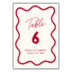 A table number card to match our Wavy Frame Retro Wedding collection. This design features the text in a chic cherry red color against a cream background framed by a hand-drawn wavy border. Please note this card is sold individually. Edit the number for each of the tables you will have at your event. View the collection linked on this page for the full wedding suite. Feel free to message me with any questions, I'll be happy to help!