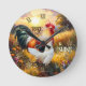 Rise and shine wall clock featuring a colorful painting of two roosters at sunrise. The numbers are optional.