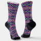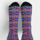 Colorful socks featuring a vibrant geometric pattern with squares and crosses in pink, blue, and yellow on a black background. Conveying fun and energy.