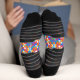Colorful socks with a jigsaw puzzle pattern in blue, red, yellow, and orange. Black heels and toes contrast vibrantly. Playful and bright design.