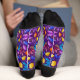 Colorful socks with intricate, symmetrical patterns in purple, blue, and yellow hues. Black toes and cuffs add contrast, creating a vibrant, lively tone.