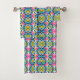 A colorful towel set with vibrant geometric patterns in blue, pink, yellow, and green hangs on a rod. A matching washcloth is folded below.