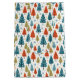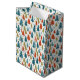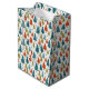 Red, gold, green, and blue stylized trees on a snowy background makes a festive and cheerful gift bag for the holidays.