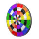 Bullseye style funky dart board in a variety of bright colors set against black and white. Yellow red green blue orange and purple.
