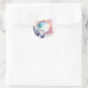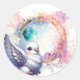 A dynamic and colorful background highlighted by a golden circular frame, showcasing a delicate watercolor painting of a dove prominently placed in the foreground.