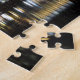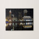 Eine klassische Ansicht der Columbus-, Ohio-Skyline und des Stadtbilds von Genua parken auf der gegenüberliegenden Seite des Scioto Flusses nachts mit den Reflexionen, die oben auf dem Wasser und dem Mond sitzen.