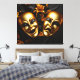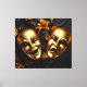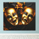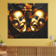 Gegen eine ausgeklügelte schwarze Leinwand tauchen zwei ikonische Theatermasken in glänzendem Gold auf, die das Wesen von Komödie und Tragödie erfassen. Eine Maske ist mit einem jubilanten Ausdruck verziert, einem Symbol des Spiegels und der Vergnügung, während die andere ein feierliches Bild trägt, das die Tiefen von Trauer und Drama verkörpert.