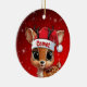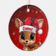 Comet! Celebrate the holiday season with this festive round ceramic red ornament featuring an endearing woodland forest animal cartoon graphic of a cute baby reindeer wearing a Santa hat. Perfect deer with antlers for decorating your tree or as a thoughtful gift, this whimsical doe decor makes a cherished keepsake for years to come. Customize by changing the text, the font, the font color, or remove the text. You can even transfer this design onto other products. Enjoy this design your way! Check out ForestBabies Xmas Deer Collection for matching decorations. 🎄🦌