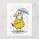 Ein Küstenvogel trotzt starkem Regen in einem leuchtend gelben Mantel und mit einem Regenschirm und verwandelt schlechtes Wetter in einen charmanten komischen Moment. Diese Illustration verbindet maritime Stimmung mit skurrilem Humor, perfekt für Küsten-Dekoration und skurrile Charakterkunst.