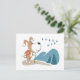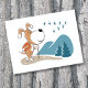 Diese Postkarte zeigt eine Cartoon-Illustration eines lustigen Welpen, der im Herbst auf dem Waldweg wandert. Blaue Berge und Bäume umgeben ihn. Der süße Hund beobachtet den Schwarm Vögel, der nach Süden zieht. Eine großartige Postkarte für Wander- und Outdoor-Fans, besonders wenn er oder sie ein Hundeliebhaber ist.