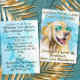 Niedliche und moderne Einladung für ein Party in der Rente, mit einem lustigen Golden Retriever an einem tropischen Strand. Originelles Design aus einer unserer handbemalten Aquarellfarben.
