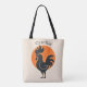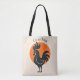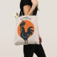 Ein schwarzer Cartoon mit einem Riesenkamm macht sich bereit, vor einer großen, orangefarbenen Sonne auf dieser lustigen Tasche zu krähen, die perfekt für Hühnerliebhaber ist.