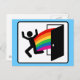 Inspiriert durch ein Warnzeichen für den Brandausgang, zeigt dieses lustige Gay Pride-Design eine Figur, die aus einem Schrank in einem Berg von Regenbögen kommt.