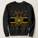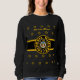 Schwarzes Sweatshirt mit goldfarbenem, schwarz-weißem konzentrischen Kreisdesign, über einem schwarz-goldenen Rechteck mit "COLUMBIA, MISSOURI CENTER OF THE UNIIVERSE" mit dem Großen Siegel Missouri in der Mitte und mit Y-NOT-ME-Logos im Hintergrund. Dieses Design ist ein Ausruf nach Columbia, Missouri, einer Stadt, die unterwegs ist.
