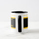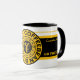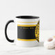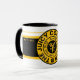 Tasse schwarz-weiß 11oz. mit einem Kreis über einem Rechteck schwarz und gold mit "THE JUICY COFFEEBEAN" im Kreis mit "Columbia, MO GO TIGERS!!!" auch mit dem Y-NOT-ME Logo. Dieses Design ist ein Ausruf für den großen Staat von Missouri, den SHOW-ME Staat. Auch zu einer wachsenden und fortschrittlichen Stadt, Columbia, Missouri.