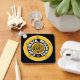 Metal Square Schlüsselanhänger schwarz mit Schwarz-weißen und goldenen konzentrischen Kreisen auf schwarzem Hintergrund mit Y-NOT-ME Logo in der Mitte umgeben von "CENTER OF THE UNIVERSE", umgeben von "COLUMBIA, MISSOURI" und umgeben von fünf Sternen. Dieses Design ist ein Ausruf für das aufstrebende athletische Programm der Universität Missouri.
