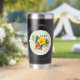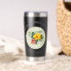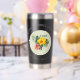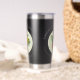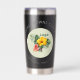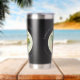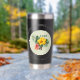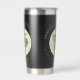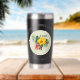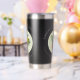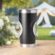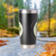 Company logo insulated tumbler. Shown in black, with other color selections. The logo and curved text will print on both sides of this drinking cup. Lettering is white with black outline to show up well no matter which color you select. Text is curved around the center logo templates and is easy to customize in two places. This item makes a nice employee gift or usable giveaway at events and trade shows.