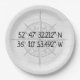 Breite und Länge GPS Position Ihrer Zuhause mit einem Kompass auf rustikal weiß getünchten Holz. Breite und Längengrad können bearbeitet werden.