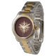 Grafisches Bild einer Kompass-Rose auf schokoladenbraunem Hintergrund.