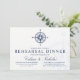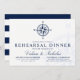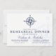 Einladungen zum Probe-Dinner mit klassischem und modernem Thema. Diese Einladungskarten verfügen über eine Darstellung der Rose des nautischen Kompasses in einem Vintagen Stil mit dem Namen der Braut und des Bräutigams zusätzlich zu den darin enthaltenen Hochzeitsdetails. Im Hintergrund verblasst ist eine Vintage Kompass-Rose für das Segeln. Auf der Rückseite sind Marinebänder und weiße Streifen, um das Aussehen zu vervollständigen. Alle Elemente dieses Elements sind über die Anpassungsfunktion einstellbar. Genießen Sie es zu kreieren und es zu Ihrem eigenen zu machen.