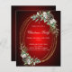 Ein roter Gradientenboden, der mit Kegel, weißen Beeren und grüner Farbe dekoriert ist. Ein ovales Imitat aus Gold. Personalisieren und fügen Sie die Details hinzu. 1 Blatt = 1 Einladung mit Druckkante bis Kante.