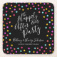 Typografisches Drehbuch moderne bunte Konfetti-Punkte, Die glücklich immer nach dem Party post Hochzeit Untersetzer auf einem schwarzen Hintergrund. Das moderne Design ist schlicht und personalisiert mit dem Namen und dem Party der verspäteten Paare nach dem Party. Die passenden Hochzeitsprodukte und andere Farbvarianten sind im Shop erhältlich. © Design by Sarah Trett for www.mylittleedenweddings.com