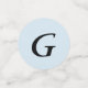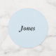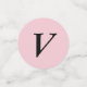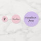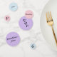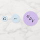 Hochzeitskonfetti mit individuellen Initialen für Braut und Bräutigam auf beiden Seiten von kleinen Punkten. Die mittleren Punkte zeigen die Nachnamen an. Große Punkte zeigen Initialen auf einer Seite und verheiratete Namen auf der Rückseite. Farbige Hintergründe sind blau für den Bräutigam, rosa für Braut und lila für Paare.