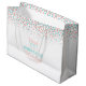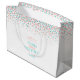 Zeigen Sie Ihren Hochzeitsreisenden mit dieser überlieferten Hochzeitsgeschenktasche Ihre Anerkennung. Perfekt, um mit einem besonderen Geschenk Ihre Wertschätzung zu zeigen. Einfach die Punktflecken zerschmettern Konfetti Grafik Gunst Tasche. Modernes Hochzeitsdesign im korallenorangen Rosa und aquamarin grünes Blau auf weißem Konfetti Hochzeitszelt Set. Personalisieren Sie diese großen Geschenktaschen mit Ihrem eigenen Namen und Ihren Namen und Ihrer Nachricht auf der Rückseite. Einzigartige Kunst und Design von Sarah Trett für www.mylittleedenweddings.com