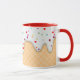 Hier ist eine lustige Tasse, die ein tolles Geburtstagsgeschenk macht, wenn sie mit der Lieblingsküche des Empfängers gefüllt ist! Das Muster ist ein Waffelkonus mit weißer Vereisung. Die Vereisung ist voll mit bunten Konfetti-Punkten. Eine Seite hat einen roten individuelle Name.