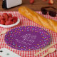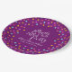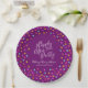 Typografisches Drehbuch moderne bunte Konfetti-Punkte, Die glücklich immer nach dem Party Post-Hochzeit Papier Teller auf einem lila Hintergrund. Das moderne Design ist schlicht und personalisiert mit dem Namen und dem Party der verspäteten Paare nach dem Party. Die passenden Hochzeitsprodukte und andere Farbvarianten sind im Shop erhältlich. © Design by Sarah Trett for www.mylittleedenweddings.com