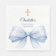 A white background color. Decorated with a large light blue colored bow and a golden cross. Personalize and add the name and date.