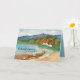 Congratulations on your new beach house greeting card featuring a peaceful seascape with beach houses tucked up against the cliffs with rugged volcanic mountains in the distance. Inspired by a beach on the island of Oahu, Hawaii. On the inside is a coordinating shade of turquoise with text you can edit to fit your needs.