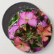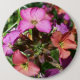 Ein Blumenknopf oder ein Abzeichen mit einem Foto einer Dauerwallblume namens "Constant Cheer". Dieser Button ist in allen Größen bis einschließlich Kolossal erhältlich.