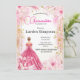 Elegant invitation for a debutante party with pink and gold glitter details. Romantic design with an illustration of flowers.