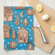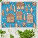Handgezeichnetes Vektormuster mit verschiedenen Lebkuchenhäusern, Tannenbäumen, Schneeflocken und mondförmigen Keksen auf blau mit fallendem Schnee