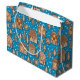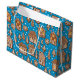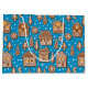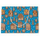 Handgezeichnetes Vektormuster mit verschiedenen Lebkuchenhäusern, Tannenbäumen, Schneeflocken und mondförmigen Keksen auf blau mit fallendem Schnee