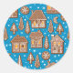 Handgezeichnetes Vektormuster mit verschiedenen Lebkuchenhäusern, Tannenbäumen, Schneeflocken und mondförmigen Keksen auf blau mit fallendem Schnee