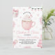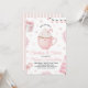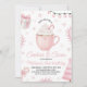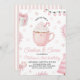 Sweet and cozy “Cookies & Cocoa” birthday invitation featuring a blush pink cocoa mug with whipped cream and candy cane. Perfect for a warm and charming first birthday celebration. Editable text, soft pastel style.