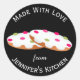 Rund gebackener Produktaufkleber in Schwarz, mit süßer Grafik von mattierten, weißen Keksen mit bunten Sprinklen. Personalisieren Sie den Text, um zu lesen, was Sie gewollt haben. Gut, um auf Ihren Paketen mit gebackenen Waren hinzuzufügen.