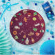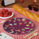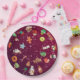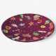 Niedliche Kekse, Kuchen und Kakao feiern die süßen Leckereien der Weihnachtszeit auf bordeauxrotem Hintergrund.