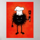 Halloween Kochdesign mit einem haarigen bösen Käfer - Koch. Der böse Charakter, der den Hut eines Koch trägt, hält einen Spatel, und das böse Grinsen zeigt seine scharfen Zähne. Diese lustige Illustration hat einen intensiv orangefarbenen Hintergrund.