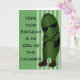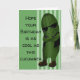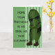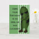 Spaß Geburtstagskarte für die coolen Menschen in deinem Leben. Auf der rechten Seite der Karte befindet sich ein grüner Gurke in dunklen Tönen, eine schwarze Weste und braune Stiefel. Er ist aufrecht stehend mit gefalteten Armen und einem frechen Lächeln. Auf der links Seite in schwarzer Schrift steht: "Hoffe, dass dein Geburtstag ein so cool ist wie dieser Gurke". Der Hintergrund ist grün mit blassgrünen Streifen.