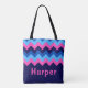 Eine mit Monogramm Tasche mit leuchtenden, farbenfrohen Mustern aus blauen und rosafarbenen Chevronen. Erstellen Sie das passende Geschenk, indem Sie auf die Schaltfläche "personalisiert" klicken, um einen Namen oder eine benutzerdefinierte Nachricht im vorgegebenen Vorlagenfeld hinzuzufügen. Klicken Sie auf den Link "Weitere Anpassung", um den Schriftart, die Textgröße und vieles mehr zu ändern.