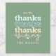 Cool blue tones text- thanks, thanks, thanks, giving - over a custom sage green background. Customizable text in pale yellow.