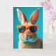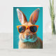 This design shows a close-up portrait of a golden-brown domestic rabbit set against a smooth, bright cyan background, with a flirty, friendly mood in the way its face is centered and gently angled toward you 🐰. Fine fur textures and crisp whiskers stand out, while the tall ears soften and fade slightly as they rise, keeping attention on the rabbit’s expression. A pair of rectangular orange-framed eye coverings rests across its nose, and the dark lenses still allow a small peek of calm blue eyes, like a shy glance. The rabbit’s pink nose sits neatly below, adding a tender detail that pairs nicely with the warm coat color. Near the top, a short Easter greeting appears in small, neat lettering in white, spaced so it doesn’t crowd the portrait 🌷. The text stays simple and centered, floating above the rabbit’s head to keep the focus on the face. The orange frames pop sharply against the cool cyan field, with the ear tips dissolving softly into the background.