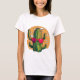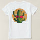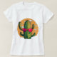 Dieses lebendige Design des T - Shirt besticht durch einen stilisierten Kakteen mit einer roten Sonnenbrille vor einem orangefarbenen Hintergrund, der einen Sonnenuntergang nahe legt. Der Kakteen hat drei Hauptverzweigungen und zwei kleinere Offshoots, die mit Linien zur Darstellung der Stacheln detailliert sind. Weiße flauschige Wolken verteilen sich im Hintergrund und verleihen dem Design ein cooles, entspanntes Ambiente.