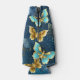 Zusammensetzung aus Fliegen, Schmuck, Gold und dunklen Schmetterlingen auf texturiertem Schmuckhintergrund. Goldener Schmetterling.