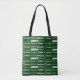 A cool personalized green allover tote bag gift for decorated in nine different fonts spelling your name in white typography. Cute customizable present for with fun cursive script.