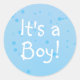 This sticker features a customizable "It's a Boy!" gender reveal announcement in a fun white font on a bright blue inkspot background.
